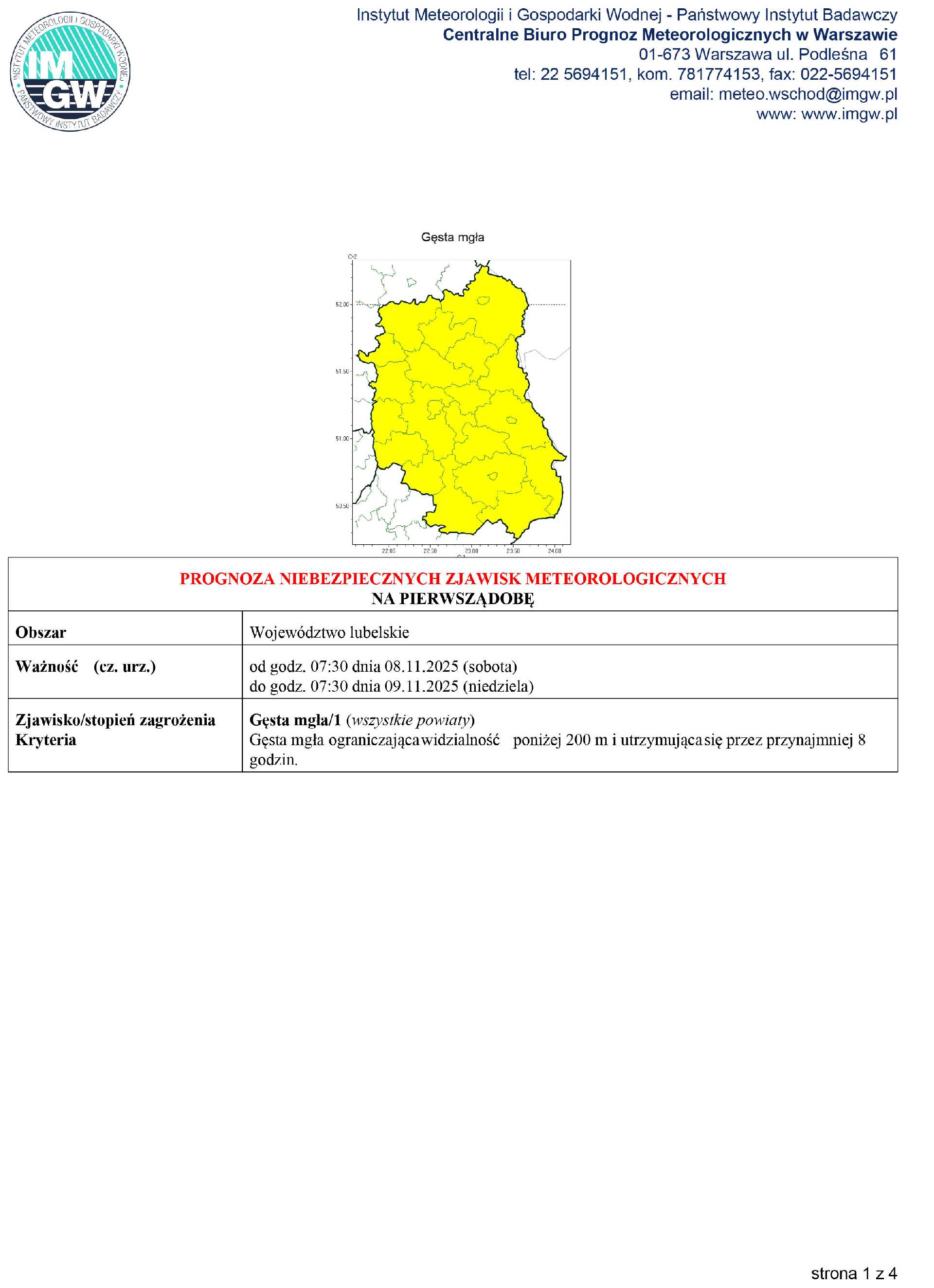 Zjawisko/stopień zagrożenia - Gęsta mgła/1 (wszystkie powiaty)