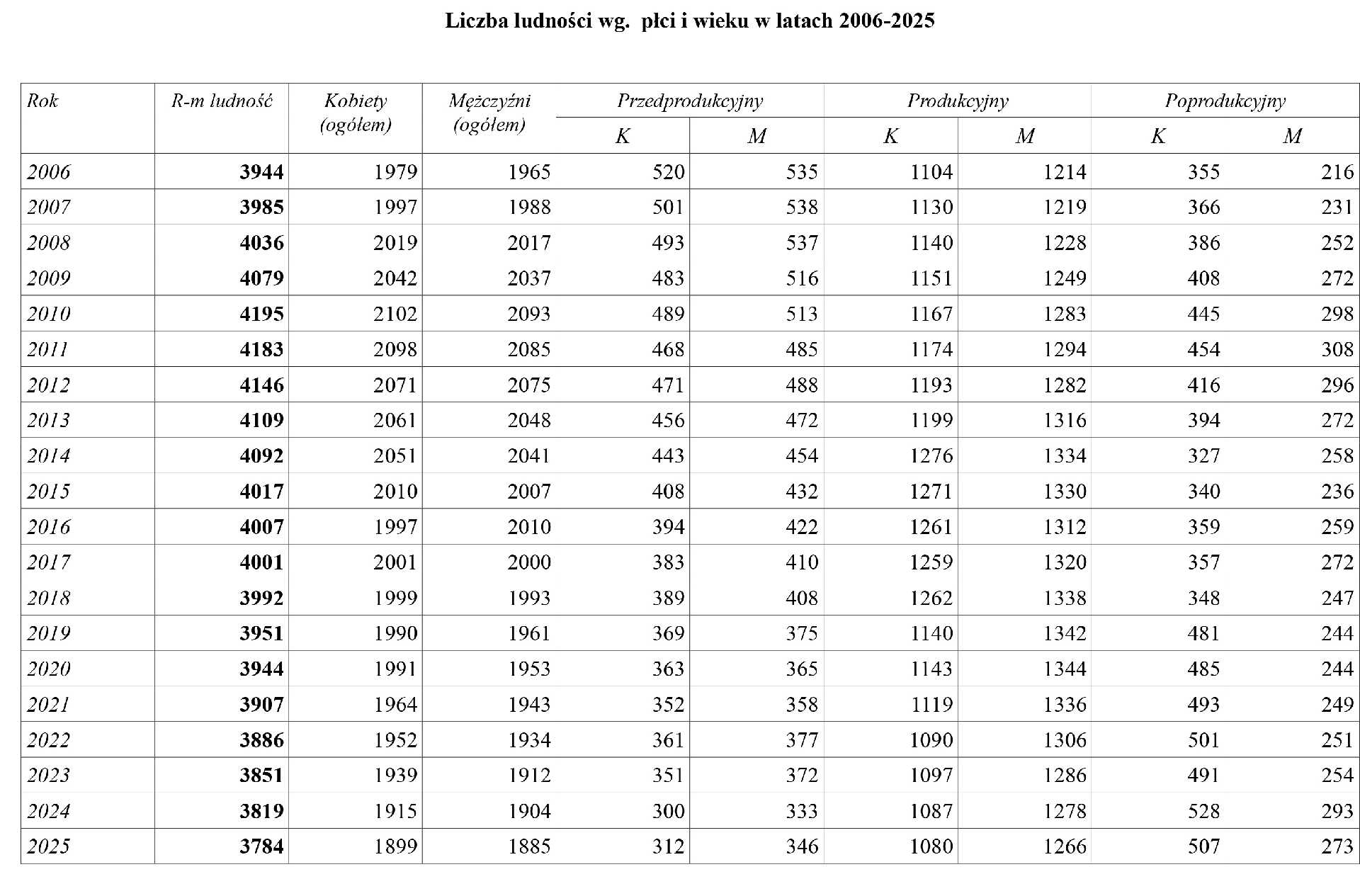 Wzorem lat ubiegłych prezentujemy dane demograficzne gminy na koniec 2025 roku w zestawieniu z latami wcześniejszymi.