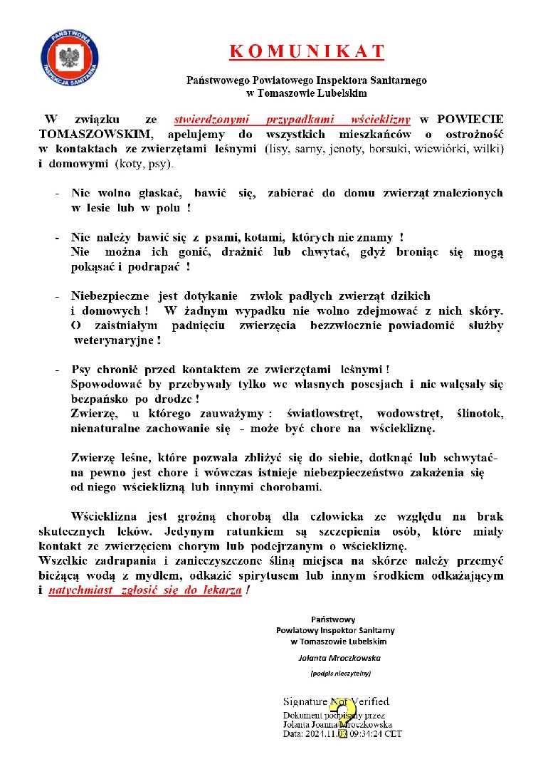W związku ze stwierdzonymi przypadkami wścieklizny w POWIECIE TOMASZOWSKIM, apelujemy do wszystkich mieszkańców o ostrożność w kontaktach ze zwierzętami leśnymi (lisy, sarny, jenoty, borsuki, wiewiórki, wilki) i domowymi (koty, psy).