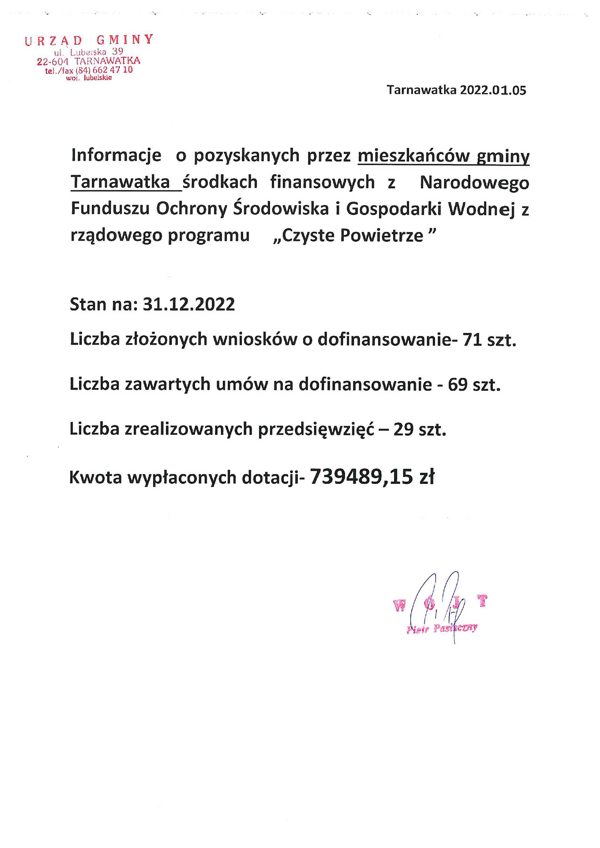 Informacje o pozyskanych przez mieszkańców gminy Tarnawatka środkach finansowych z Narodowego Funduszu Ochrony Środowiska i Gospodarki Wodnej z Rządowego programu "Czyste powietrze"