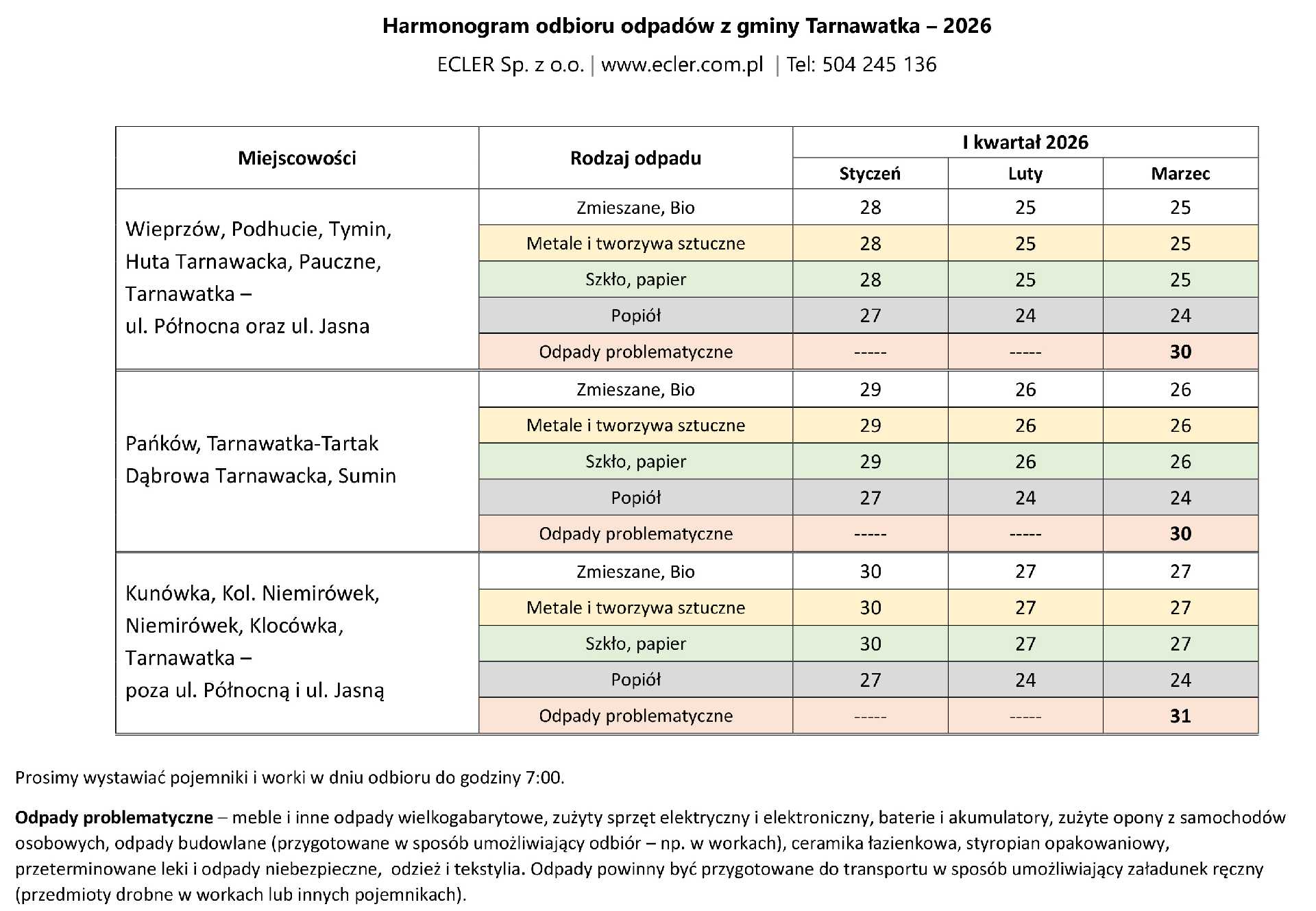 Harmonogram odbioru odpadów z gminy Tarnawatka – 2026