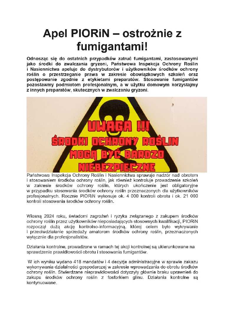 Apelujemy, w szczególności do dystrybutorów i użytkowników środków ochrony roślin, aby przy sprzedaży i zakupie środków ochrony roślin przeznaczonych dla użytkowników profesjonalnych, w szczególności fumigantów zawierających fosforek glinu, przestrzegali przepisów prawa, w tym obowiązków posiadania ukończenia szkolenia z zakresu środków ochrony roślin oraz stosowania środków ściśle z etykietą. Nierespektowanie powyższych zasad może zagrażać zdrowiu i życiu użytkowników oraz ich rodzin.